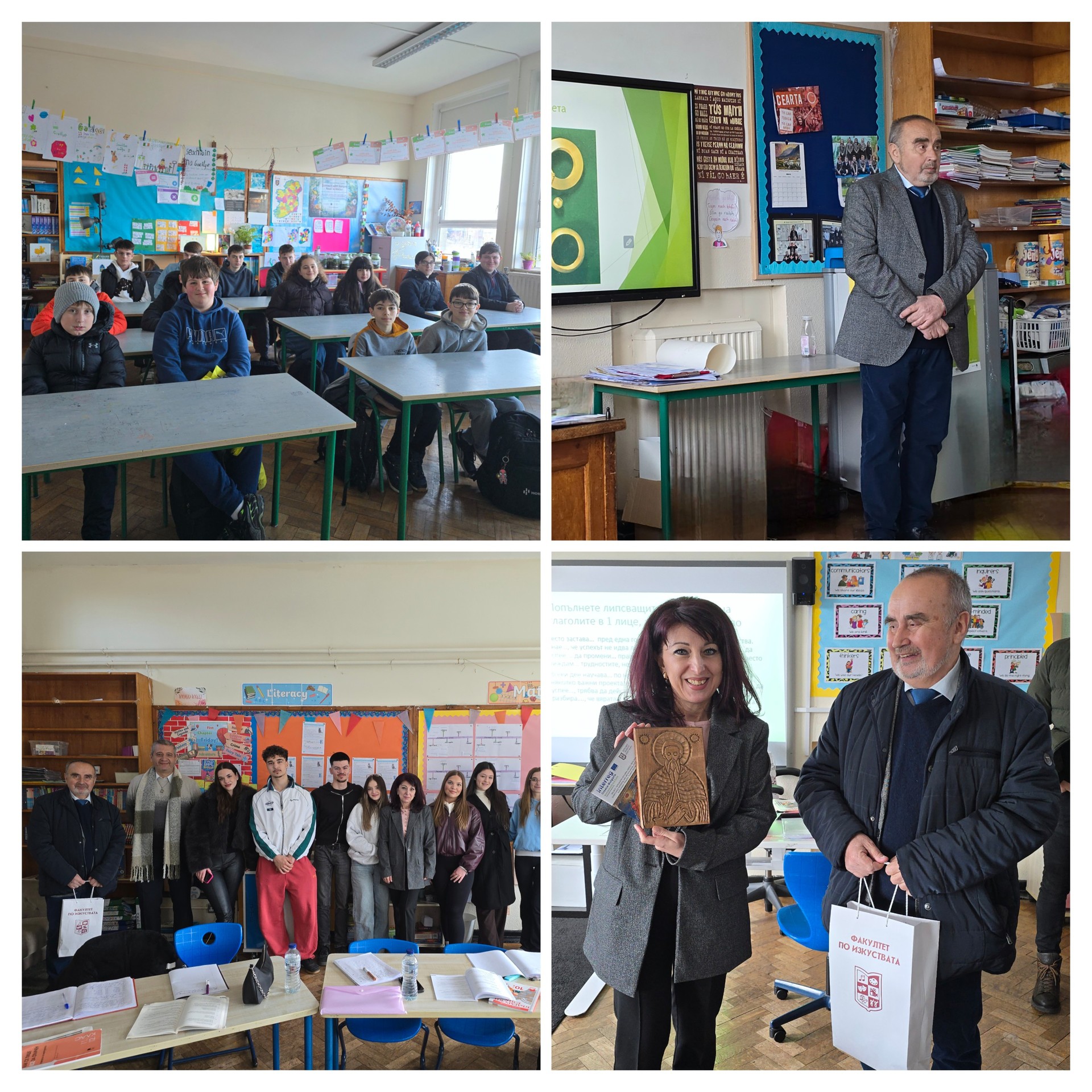 На 28 март нашето училище отвори врати за скъпи гости - преподаватели от Факултета по изкуствата в ЮЗУ "Неофит Рилски" Благоевград с мобилност по програма Еразъм+. С нетърпение очаквахме срещата, защото вече знаехме програмата на посещението.